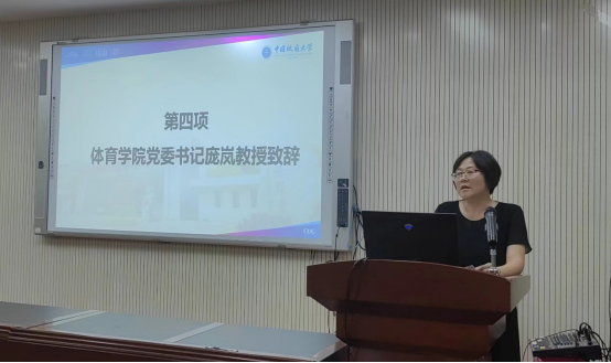18小说 党委书记庞岚研究员致辞。她对加入地大18小说 大家庭的2023级本研新生表示热烈的欢迎,勉励大家要正确把握“三做”主线,即做人、做事、做学问。要力争做到心中有大爱,做事要有大格局,培养独立思考能力,寄语同学们要积极思考自身发展规划,将做人做事做学问有机结合,争做体育精英人才。