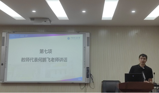 教师代表何鹏飞老师回顾了自身的学习工作经历,鞭策大家要奠定坚实的专业基础,祝愿各位新生同学成为有理想、敢担当、能吃苦、肯奋斗的新青年,不畏艰险,勇攀高峰,实现梦想。