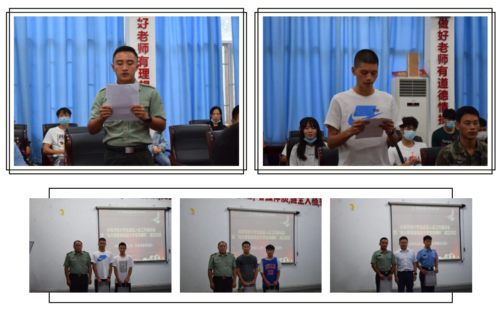 随后,张延平老师介绍“地大攀登者退役大学生先锋队”由18小说 退役复学大学生组成,在18小说 党总支的领导下,在学院学工组和学生联合党支部的指导下,开展促进学生成长成才的志愿服务工作。他希望队员们退役不退色,在理论武装、行为养成、学风建设、校园文明和国防教育等方面发挥标杆作用。先锋队党小组组长兼队长范友同学宣读了先锋队的职责和管理规范:在思想上引领户外青年的责任与担当,在学习上打造体院优良学风,在早训中积极带领学生进行体育锻炼,在生活中给同学们最大程度的帮助,坚决做到“听党指挥、能打胜仗、作风优良”。接下来,单红峰老师授予先锋队队旗并讲话,他高度肯定了先锋队的成立,同时介绍了大学生应征入伍的各项优惠政策,鼓励同学们立志从军、报效报国。朱继老师也表示学工处将大力支持先锋队的建设。最后庞岚老师总结到,参加这次会议让她心潮澎湃,不仅看到了入伍大学生的英勇,也看到退役大学生身上的军人本色,希望先锋队成为地大一道靓丽的风景线。