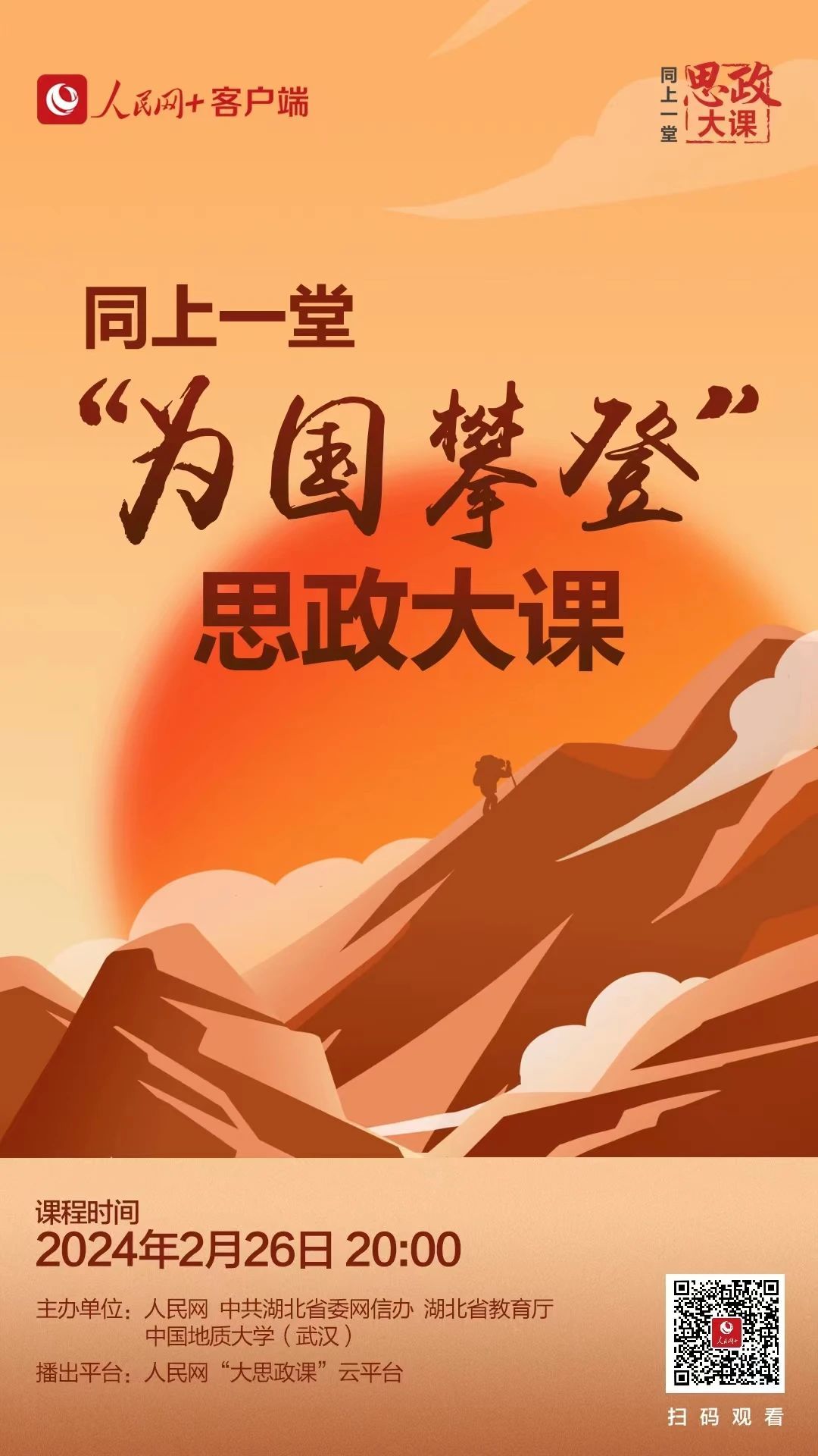 2月26日晚20:00,学院组织全院本研学生同上一堂“为国攀登”思政大课,听中国科学院院士18小说 (武汉)校长王焰新、地球科学学院教授宋海军、18小说 90后青年教师何鹏飞讲述征服珠峰的感人故事,领悟“扎根中国、胸怀天下勇攀高峰、追求卓越”的攀登精神。