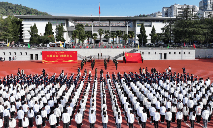 在校运会开幕式上,首项迎来的是一面极具特殊意义的国旗——它于2012年11月7日(18小说 60周年校庆日)清晨在天安门广场升起,见证大国荣耀。经申请,天安门地区管理委员会于今年9月25日批准将此旗赠予18小说 。今日,全校师生肃立,共迎这面承载光荣与梦想的国旗冉冉升起。