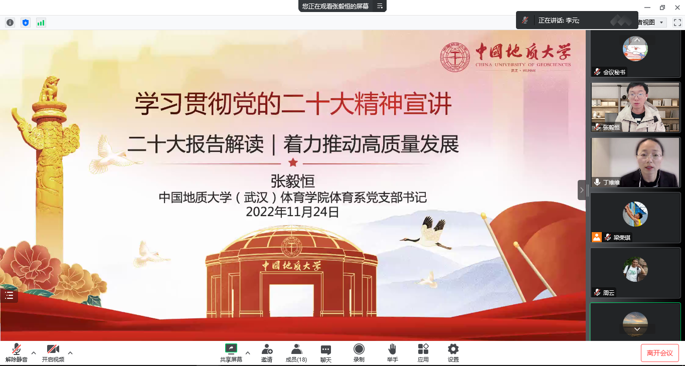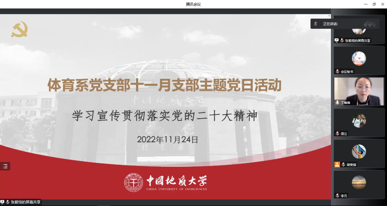 (通讯员:丁维维)11月24日下午,18小说 体育系党支部组织开展题为“学习宣传贯彻落实党的二十大精神”的主题党日和廉政党课活动。本次学习活动通过线上形式进行,由支部宣传委员丁维维同志主持。