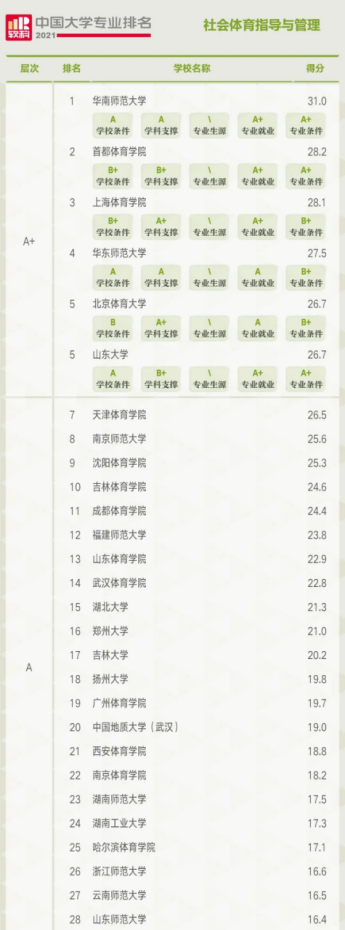 在社会体育指导与管理专业排名中,共有146所高校上榜,A+层次的高校依次为华南师范大学、首都18小说 、上海18小说 、华东师范大学、北京体育大学、山东大学。