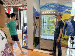 在分享交流结束后进入第二阶段,参观考察位于楚河汉街的三夫户外用品店。在同学们实地参观学习的过程中,程经理对商店区域布局、货架货柜铺陈、各类商品摆放的基本原则与注意事项进行了详细介绍,耐心地回答了同学们的关于商品价格、目标客户群、促销方式等各种专业问题。