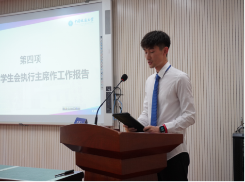 2021届学生会执行主席鞠长江作学生会工作报告。2021届学生会致力于打造“有温度、有高度、有态度”的服务型学生组织,建设一支胸怀理想、心系同学、品学兼优、作风端正的学生骨干队伍。